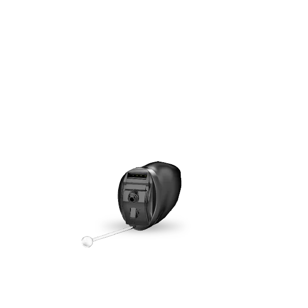 Custom hearing aids that are partially visible in the outer ear.